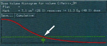 Hình 16: Biểu đồ thể tích liều (DVH) của dao gamma. Đường đứt nét màu xanh có thể bị xô lệch vài điểm trên biểu đồ (màu đỏ) để đạt được liều tương tự tới mỗi đường đồng liều. Trong trường hợp này thể tích tương ứng tới 40% đường đồng liều dường như là 7,1cm3 (mũi tên)