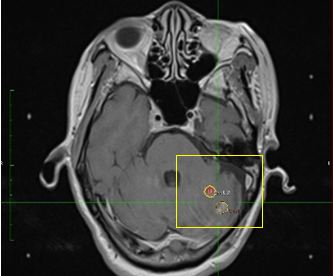 Bệnh nhân Ngô Hữu V.; nam, 60 tuổi. Chẩn đoán: Ung thư phổi di căn tiểu não, chỉ định: xạ phẫu dao gamma quay (RGK) liều 22Gy”