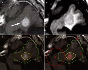 Hình 23: Hình ảnh mô tả kế hoạch bên trong kế hoạch. Hình (A) Chụp cộng hưởng từ bệnh nhân có glioblastoma cho thấy khối u tăng ở thùy thái dương bên trái (mũi tên). Hình (B) hình ảnh này có ý nghĩa quan trọng biểu hiện tổ chức quanh u trên xung FLAIR. Hình (C) xây dựng kế hoạch xạ phẫu gamma vùng xung quanh ngấm thuốc khối u với đường đồng liều 50% (màu vàng), trên xung FLAIR là 38% (màu xanh). Hình (D) Tương tự như kế hoạch C chỉ ra vị trí xuất hiện của 2 shot.
