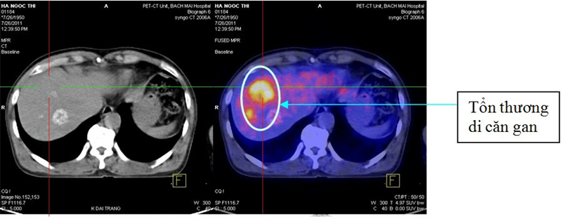 Lai cùng cs và Schiepers cùng cs cho thấy PET/CT là phương pháp có độ nhạy cao trong chẩn đoán giai đoạn của ung thư đại trực tràng tái phát. Trong nghiên cứu trên 58 bệnh nhân có tổn thương di căn gan được đánh giá và kiểm tra trước phẫu thuật: 46/58 bệnh nhân được đánh giá giai đoạn bằng các phương pháp thông thường và thống nhất với kết quả của PET/CT. Các kết quả được khẳng định bằng chẩn đoán mô bệnh học hoặc theo dõi. Ở 43/46 bệnh nhân: cả phương pháp thông thường và FDG-PET đều không thấy tổn thương di căn ngoài gan. Có 2 trong 46 bệnh nhân, CT và PET/CT đều thấy có tổn thương di căn phổi. Trên các bệnh nhân khác tỷ lệ dương tính giả ở cả CT và PET/CT do viêm phổi, 12 trong 58 bệnh nhân không thấy có sự phù hợp giữa PET/CT và các phương pháp chẩn đoán giai đoạn thông thường. Trong các trường hợp đó chỉ PET/PET cho giá trị chẩn đoán chính xác về các tổn thương di căn ngoài gan; trong 12 trường hợp này, có 6 trường hợp có tổn thương tái phát (2 trường hợp có tổn thương di căn phổi, 1 trường hợp di căn hạch trung thất, 1 trường hợp di căn xương, 1 trường hợp di căn hạch thượng đòn và 1 trường hợp di căn hạch ổ bụng).