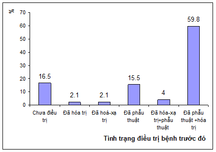Nhận xét: 16 bệnh nhân chưa được điều trị trước đó (16,5%); 58 bệnh nhân đã được điều trị phẫu thuật + hóa trị (59,8%); 15 bệnh nhân đã được phẫu thuật (15,5%)