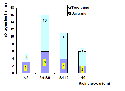 - Kích thước tổn thương u tại đại tràng trung bình là 5,55±3,39; Kích thước tổn thương u tại trực tràng trung bình là 5,70±2,91.