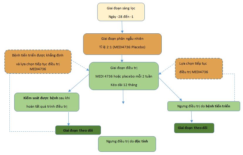 Đây là nghiên cứu pha III, đa trung tâm, dự kiến tuyển khoảng 700 bệnh nhân từ 330 trung tâm ở Úc, châu Á, châu Âu, Nam và Bắc Mỹ, Nam Phi. Những bệnh nhân đủ tiêu chuẩn sẽ được phân bổ ngẫu nhiên theo tỉ lệ 2:1 cho 2 nhánh điều trị với MEDI4736 hoặc giả dược (placebo). Thuốc sử dụng trong nghiên cứu sẽ được truyền tại trung tâm nghiên cứu và bệnh nhân sẽ được theo dõi chặt chẽ trong và sau quá trình điều trị.