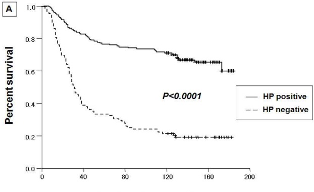 Nghiên cứu của khoa ung thư Bệnh viện đai học Ajou, Hàn Quốc trên 274 bệnh nhân ung thư dạ dày từ giai đoạn Ib-IV được phẫu thuật triệt căn có vét hạch, hóa trị bổ trợ và xét nghiệm HP trên mô bệnh học. Kết quả cho thấy tình trạng HP có liên quan tới tỉ lệ sống còn.