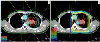 So sánh 2 đường đồng liều giữa hai kế hoạch xạ trị JO-IMRT (trái) và kế hoạch xạ trị 3D thông thường : Ở kỹ thuật JO-IMRT, đường đồng liều 95% bao sát thể tích cần tia (khối u và hạch), đồng thời tránh được các mạch máu lớn, tuỷ sống và phần phổi lành.