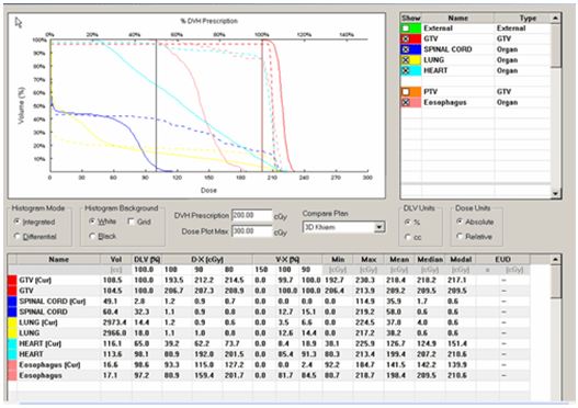 2. Xác định các thể tích cần bảo vệ bao gồm phổi lành, tuỷ sống, thực quản, tim và các mạch máu lớn. Liều tối đa cho nhu mô phổi không quá 20Gy, tốt nhất không quá 15Gy, cho tuỷ sống không quá 45Gy, cho thực quản không quá 50Gy đối với xạ trị riêng rẽ và không quá 40Gy đối với hoá xạ trị đồng thời. Cần lưu ý rằng hoá xạ trị đồng thời thì không dùng phác đồ có Doxorubicin và Methotrexate vì làm tăng nhiều độc tính nguy hại.