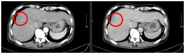 Hình 3: Hình ảnh chụp cắt lớp vi tính ổ bụng: U gan hạ phân thùy VIII (vòng tròn đỏ) kích thước 50x77mm, ngấm thuốc không đều, có thải thuốc sau tiêm sau điều trị, còn tăng sinh mạch, không có huyết khối