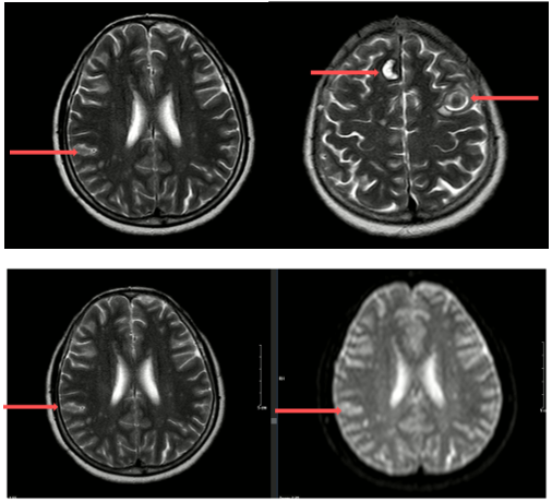 Hình 1: Hình ảnh các khối, nốt tổn thương có chảy máu thùy trán phải, góc cầu tiểu não trái, các nốt chảy máu thùy trán trái, thùy thái dương - thùy chẩm phải - theo dõi các tổn thương thứ phát.