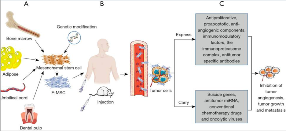 Tại Hoa Kỳ, sự phát triển thành công của tế bào CAR-T (chimeric antigen receptor T cells) báo trước sự xuất hiện của kỷ nguyên thuốc gen và tế bào cũng như phương pháp chữa trị khối u. Liệu pháp tế bào CAR-T đã tạo ra những kết quả trong điều trị một số bệnh ác tính về huyết học. Những bệnh nhân đầu tiên mắc bệnh bạch cầu tế bào B tái phát hoặc kháng trị được điều trị bằng tế bào CAR-T nhắm mục tiêu CD19 đã cho thấy phản ứng thuận lợi. Vì vậy, liệu pháp tế bào CAR-T mang lại sự lạc quan ở một số bệnh nhân có khối u ác tính về huyết học tái phát và khó chữa. Liệu pháp tế bào CAR-T đã được FDA phê duyệt vào năm 2017 để điều trị TẤT CẢ và điều trị ung thư hạch tế bào B lớn lan tỏa ở Hoa Kỳ. FDA cũng đã nhận được sự chấp thuận cho việc sử dụng liệu pháp tế bào CAR-T để điều trị ung thư hạch tế bào vỏ vào năm 2020 và đa u tủy vào năm 2021. Tuy nhiên, hầu hết bệnh nhân có khối u ác tính tế bào B được phát hiện tái phát trong vòng 1 đến 2 năm sau khi điều trị bằng tế bào CAR-T. Các cơ chế phổ biến liên quan đến tái phát sau điều trị bằng tế bào CAR-T bao gồm mất kháng nguyên khối u, cạn kiệt tế bào T và ức chế miễn dịch của vi môi trường khối u (TME). Hơn nữa, có nhiều trở ngại ngăn cản việc sử dụng liệu pháp miễn dịch tế bào CAR-T trong điều trị khối u rắn. Do đó, việc nghiên cứu các loại thuốc gen và tế bào hiệu quả hơn để điều trị ung thư, đặc biệt đối với các khối u rắn, là rất cần thiết và MSC có thể là một lựa chọn lý tưởng.