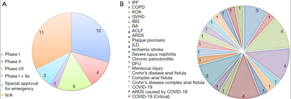 Hình 1. Tiến trình và ứng dụng của các thử nghiệm lâm sàng đối với các loại thuốc liên quan đến MSC đã được Trung tâm đánh giá thuốc (CDE: the National Center for Drug Evaluation) phê duyệt tại Trung Quốc. (A): Tiến trình chủ yếu diễn ra trong các thử nghiệm giai đoạn I và II. (B): Có 34 thử nghiệm đăng ký nghiên cứu thuốc mới dành cho MSC.