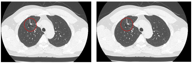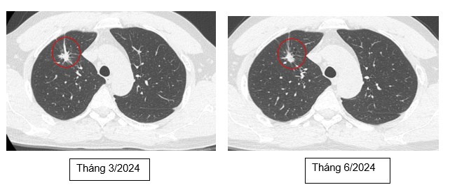 Cắt lớp vi tính ngực: Nhu mô thùy trên phổi phải có nốt đặc bờ không đều kích thước 6x4mm, xung quanh có các ổ giãn phế nang và các dải xơ co kéo nhẹ nhu mô phổi, hạn chế đánh giá tính chất ngấm thuốc do kích thước nhỏ. Ngoài ra nhu mô thùy trên có vài nốt đặc nhỏ <4mm, giới hạn rõ, bờ đều. Không thấy giãn phế quản - phế nang.