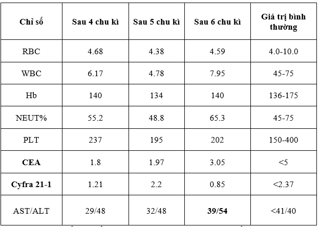 Nhận xét: Các chất chỉ điểm CEA, Cyfra 21-1 sau các chu kì điều trị duy trì trong giới hạn bình thường, bệnh nhân có tăng men gan nhẹ sau 5 chu kì điều trị.
