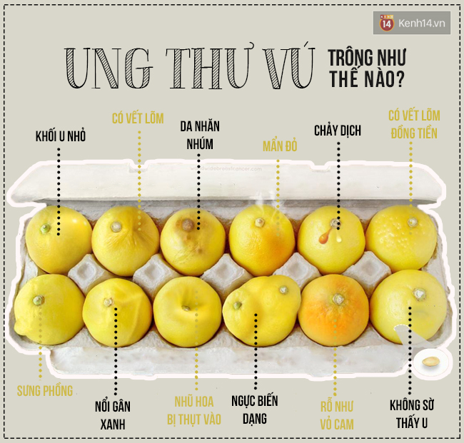 Với tỉ lệ mắc và mức độ nguy hiểm cao, ung thư vú nhận được rất nhiều sự quan tâm của cộng đồng phái nữ. Mới gần đây, bức ảnh 10 quả chanh – hình tượng hóa những dấu hiệu ung thư vú do chị Eric Smith (Mỹ) chia sẻ đã được cộng đồng mạng lan truyền rầm rộ. Là một người chiến thắng căn bệnh ung thư vú, hơn ai hết chị hiểu rõ những dấu hiệu và tốc độ tiến triển chóng mặt của căn bệnh này. Kể cả khi không sờ thấy khối u, bạn vẫn có thể nhận biết ung thư vú với những vết lõm, mẩn đỏ, chảy dịch, gân xanh,…