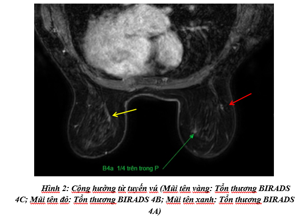 Vú phải: Vị trú khoảng 9h vùng đuôi vú, có nốt kích thước 8x11 mm (BIRADS 4B), kèm dải ngấm thuốc chạy về phía trước dài 27mm. Vị trí 2h cách núm vú 3cm có nốt nhỏ đường kính 5mm (BIRADS 4A).