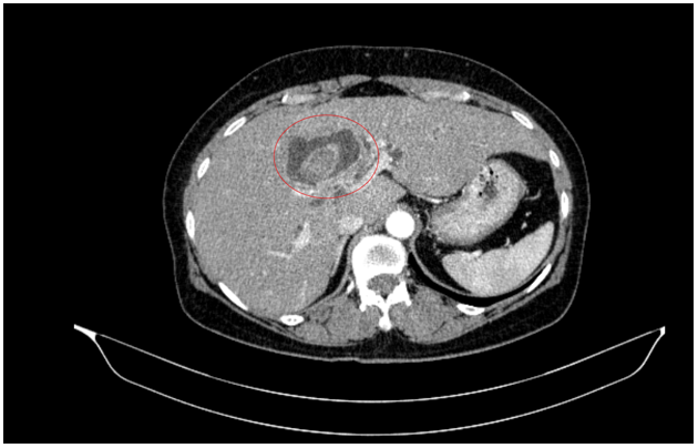 Hình 1. Hình ảnh sỏi đường mật tạo ổ áp xe gan - đường mật gan trái (vòng tròn màu đỏ). Giãn nhẹ đường mật trong gan hai bên. Dày thành nhẹ ngã ba đường mật trên phim chụp cắt lớp vi tính.