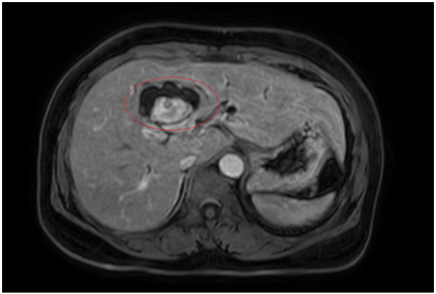 Đánh giá tổn thương trên phim chụp cộng hưởng từ: Nhu mô hạ phân thuỳ IV có ổ tổn thương dạng dịch, kích thước 38x52mm, trong có vài sỏi, sỏi lớn nhất kích thước ~27x37mm, có thông với nhánh đường mật gan phải lân cận, ngấm thuốc viền sau tiêm, chèn ép ngã ba đường mật, gây giãn đường mật trong gan hai bên