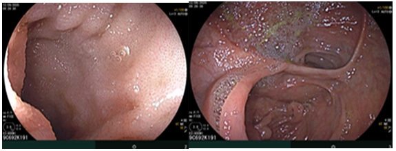 Nội soi đại tràng (thời điểm sau phẫu thuật): Đã phẫu thuật cắt đại tràng phải, nối kiểu tận bên, niêm mạc miệng nối bình thường.