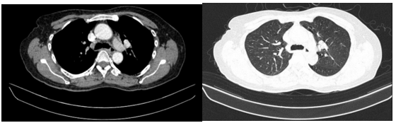 Hình ảnh chụp cắt lớp vi tính ngực: Dải xẹp phổi rải rác thuỳ dưới hai phổi. Nhu mô còn lại đồng nhất, không thấy tổn thương khu trú hoặc lan tỏa. Không thấy tổn thương hình mờ dạng lưới. Không thấy giãn phế quản – phế nang.