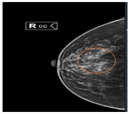 Hình Xquang tuyến vú: Vú phải vị trí 1/4 trên ngoài có hình ảnh đám tăng đậm độ bất xứng khu trú, bên trong có nốt vôi hóa đa hình rõ (vòng tròn màu cam).
