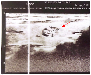 Hình 2: Hình ảnh siêu âm tuyến vú: Hình ảnh nốt giảm âm 1/4 trên ngoài vú phải (BIRADS 4) (mũi tên màu đỏ).