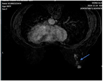 Hình ảnh cộng hưởng từ tuyến vú có tiêm tương phản. Hình ảnh đám ngấm thuốc trung tâm vú phải đã lan tới núm vú (BIRADS 6) (mũi tên màu xanh dương).