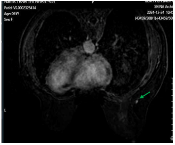 Hình 4: Hình ảnh cộng hưởng từ tuyến vú có tiêm tương phản. Hình ảnh Hạch trong nhu mô vú phải vị trí 8h (BIRADS 3) (mũi tên màu xanh lá).