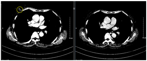 Hình ảnh so sánh phim chụp cắt lớp vi tính lồng ngực trước điều trị (bên trái) và sau điều trị tân bổ trợ 6 chu kỳ (bên phải). Nốt ngấm thuốc ngực phải trước điều trị (hình tròn màu vàng) đã biến mất hoàn toàn.
