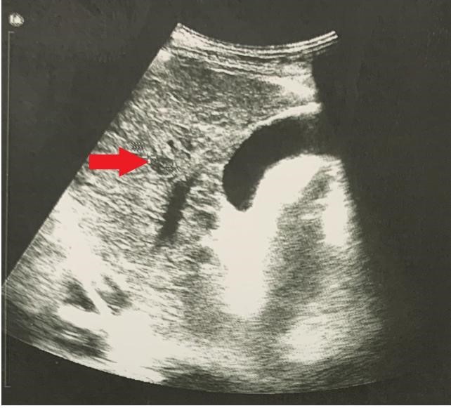 Hình 1: Hình ảnh siêu âm gan: có nốt giảm âm hạ phân thùy V (mũi tên đỏ)
