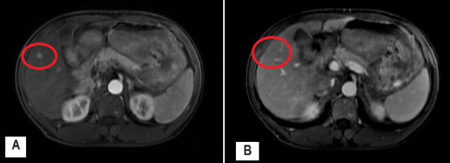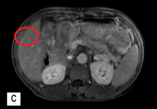 Hình 2: Hình ảnh MRI ổ bụng: nốt hạ phân thùy S5 (vòng tròn màu đỏ) (A: thì động mạch, B: thì tĩnh mạch, C: thì muộn)