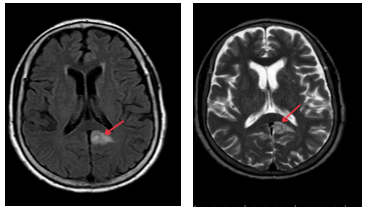 Hình 2: Cộng hưởng từ sọ não lúc mới nhập viện: Tổn thương tăng tín hiệu trên FLAIR tại bán cầu tiểu não trái và thùy đỉnh trái cạnh não thất (mũi tên đỏ).