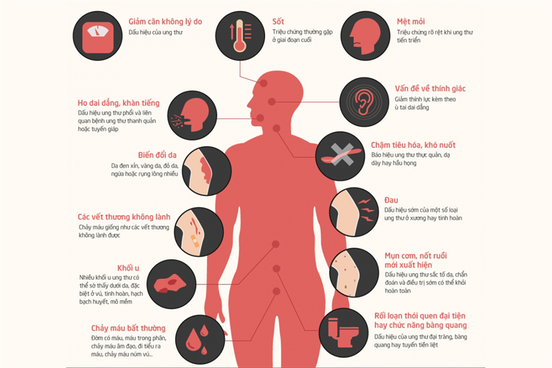 Các triệu chứng thường gặp của bệnh ung thư Ngày đăng: 24/11/2015 Lượt xem 1993 Cần đi khám ngay khi da xuất hiện mụn cơm, nốt ruồi, giảm cân đột ngột hay chảy máu bất thường… vì có thể bạn đang bị một loại ung thư nào đó. Theo http://vnexpress.net