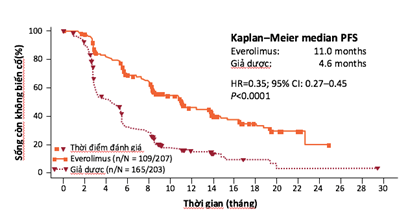 Everolimus là thuốc ức chế con đường mTOR (con đường điều hoà tăng trưởng, tăng sinh, trao đổ chất của tế bào và tăng sinh mạch). Nghiên cứu RADIANT-3 cho thấy nhóm bệnh nhân NETs di căn đưc điều trị Everolimus có thời gian sống thêm không tiến triển (PFS) vượt trội nhóm không điều trị: 11,0 tháng so với 4,6 tháng (hình 3).