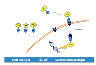 Phương pháp điều trị hiệu quả khác là điều trị phóng xạ thụ thể peptid (PRRT). Đây là phương pháp sử dụng đồng vị phóng xạ gắn với peptid như Octerotide, DOTATOC, DOTATATE (là peptid có ái lực cao với thụ thể SSTR2 trên bề mặt khối u thần kinh nội tiết), phức hợp này thông qua các thụ thể SSTR trên bề mặt tế bào u đi vào trong khối u và phát ra bức xạ tiêu diệt tế bào (hình 4).