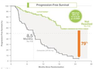 Nghiên cứu NETTER-1 cho thấy nhóm bệnh nhân NETs tiến triển, di căn được điều trị bằng thuốc phóng xạ gắn peptid (177Lu-DOTATE) + Octreotate và nhóm bệnh nhân chỉ điều trị bằng Octreotide LAR: thời gian sống thêm không tiến triển PFS ~ 40 tháng trong khi nhóm còn lại chỉ điều trị bằng Octreotide: PFS ~ 8,5 tháng (hình 5)