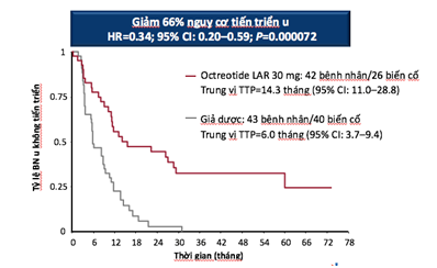 Nghiên cứu pha III PROMID cho thấy nhóm bệnh nhân NETs điều trị bằng Octreotide LAR có thời gian sống đến khi bệnh tiến triển (TTP) vượt trội so với nhóm không điều trị: 14,3 tháng so với 6,0 tháng (hình 1).