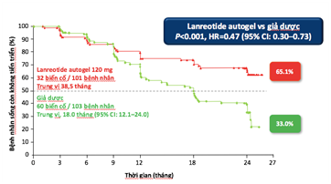 Nghiên cứu pha III CLARINET cho thấy nhóm bệnh nhân NETs được điều trị bằng Lanreotide có thời gian sống thêm không tiến triển (PFS) vượt xa so với nhóm không điều trị: PFS 38,5 tháng so với 18 tháng (hình 2).