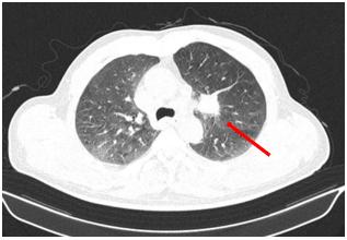 Hình 2. Hình ảnh khối u phổi phải trên phim chụp Cắt lớp vi tính ngày 19 tháng 03 năm 2025 (mũi tên).