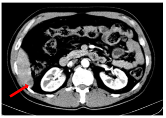 Hình 3. Hình ảnh khối u gan (mũi tên)