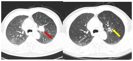 Hình 4. Hình ảnh phim chụp cắt lớp vi tính ngực ngày 10 tháng 7 năm 2025 (mũi tên vàng) so với ngày 19 tháng 03 năm 2025 (mũi tên đỏ), kích thước khối u giảm đáng kể so với phim chụp cũ.