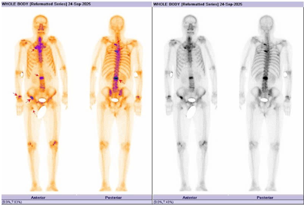 Hình 4: Hình ảnh xạ hình xương cho thấy các ổ tăng hoạt độ phóng xạ nhiều vị trí tại xương cột sống, xương đòn phải, xương chậu phải, cung sau xương sườn 2, 5 bên trái, đầu dưới xương cẳng tay bên phải, đầu trên xương đùi phải hướng đến tổn thương thứ phát.