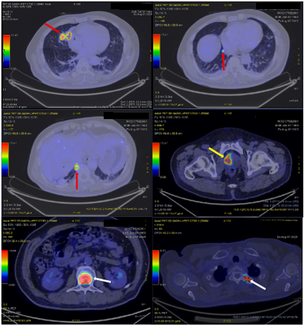 Hình 5: Hình ảnh PET/CT cho thấy: 02 khối u phổi phải, kích thước lớn nhất 16 x 23 mm, xâm lấn vào trung thất (SUVmax: 17,8) và các nốt đặc nhỏ rải rác nhu mô hai phổi, tăng hấp thu FDG (SUV: 10,5) (mũi tên đỏ). Hình ảnh các tổn thương tại xương (mũi tên trắng) tương ứng với các vị trí tổn thương quan sát thấy trên xạ hình xương (SUVmax: 22,2). Hình ảnh nốt tuyến thượng thận trái(mũi tên xanh), tăng hấp thu FDG (SUVmax: 15,2). Hình ảnh tăng hấp thu FDG tại vùng chuyển tiếp,vùng ngoại vi bên phải tuyến tiền liệt và thành dưới bàng quang (SUVmax: 17,1) (mũi tên vàng).
