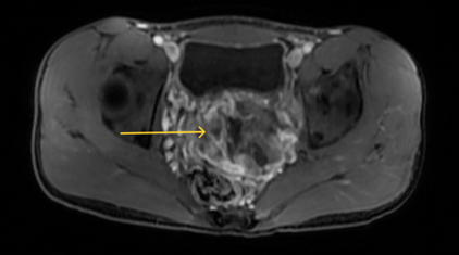 Hình 1: Hình ảnh MRI ổ bụng có khối ở vùng tiểu khung, tăng tín hiệu trên T2W (mũi tên vàng)