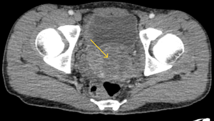 Hình 2: Hình ảnh chụp CT ổ bụng có khối vùng tiểu khung lệch trái chèn ép gây giãn đài bê thận - niệu quản trái (mũi tên vàng)