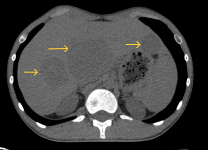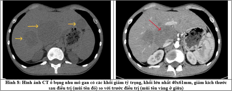 Hình 3: Hình ảnh chụp CT ổ bụng có các khối giảm tỷ trọng ở nhu mô gan 2 bên, bờ đều rõ (mũi tên vàng)