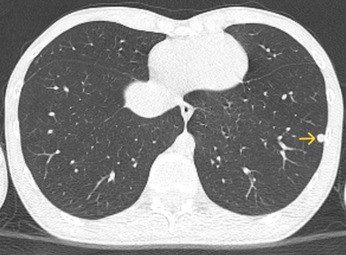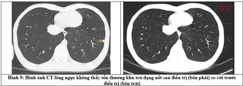 - CLVT lồng ngực không tiêm thuốc cản quang: Phổi phải: thùy giữa có nốt đặc nhỏ đường kính khoảng 2mm, bờ đều. Phổi trái: phân thùy lưỡi, thùy dưới có nốt đặc đường kính lần lượt là ~ 2mm và 6mm, bờ đều.