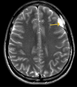 Hình 5: Hình ảnh MRI sọ não nốt tăng tín hiệu trên T2W, giảm tín hiệu trên T1W, xâm lấn xương trán trái (mũi tên vàng)