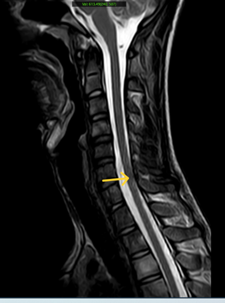 Hình 6: Hình ảnh MRI cột sống cổ có phù tủy xương thân đốt sống (mũi tên vàng)