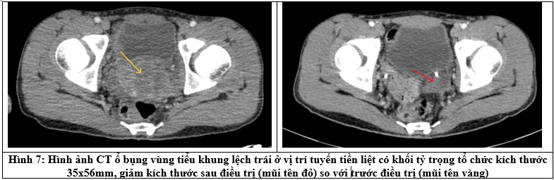 Bệnh nhân được chụp CT ổ bụng phát hiện có khối vùng tiểu khung lệch trái gây chèn ép giãn đài bể thận niệu quản trái kèm các hạch vùng tiểu khung, các khối ở gan, các nốt ở 2 bên phổi, nên bệnh nhân được chỉ định đặt sonde JJ niệu quản 2 bên tại Khoa Phẫu thuật Tiết niệu Bệnh viện Bạch Mai.