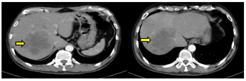 Bệnh sử: Cách vào viện 2 tháng, bệnh nhân xuất hiện đau âm ỉ hạ sườn phải, đau tăng dần, uống thuốc giảm đau không đỡ, kèm mệt mỏi, ăn uống kém, gầy sút cân 2kg/tháng, không nôn, không sốt, đại tiểu tiện bình thường, đi khám tại bệnh viện Bạch Mai chụp cắt lớp vi tính bụng có hình ảnh gan phải có khối lớn kèm nhiều nốt nhỏ lân cận, kích thước lớn nhất 87x93mm, ngấm thuốc kém sau tiêm, theo dõi thứ phát . Bệnh nhân được chuyển đến Trung tâm Y học hạt nhân và Ung bướu Bệnh viện Bạch Mai chẩn đoán và điều trị tiếp.