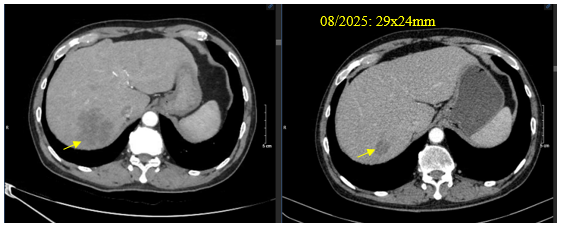 Chụp cắt lớp vi tính bụng: Tổn thương gan phải giảm kích thước: 45x47mm